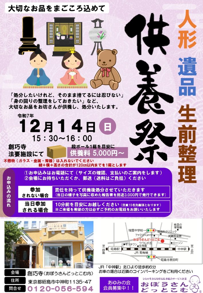 お申込み後、当日までに東京都昭島市「創巧寺」にお持ち込みいただくか、郵送等でお送りください。